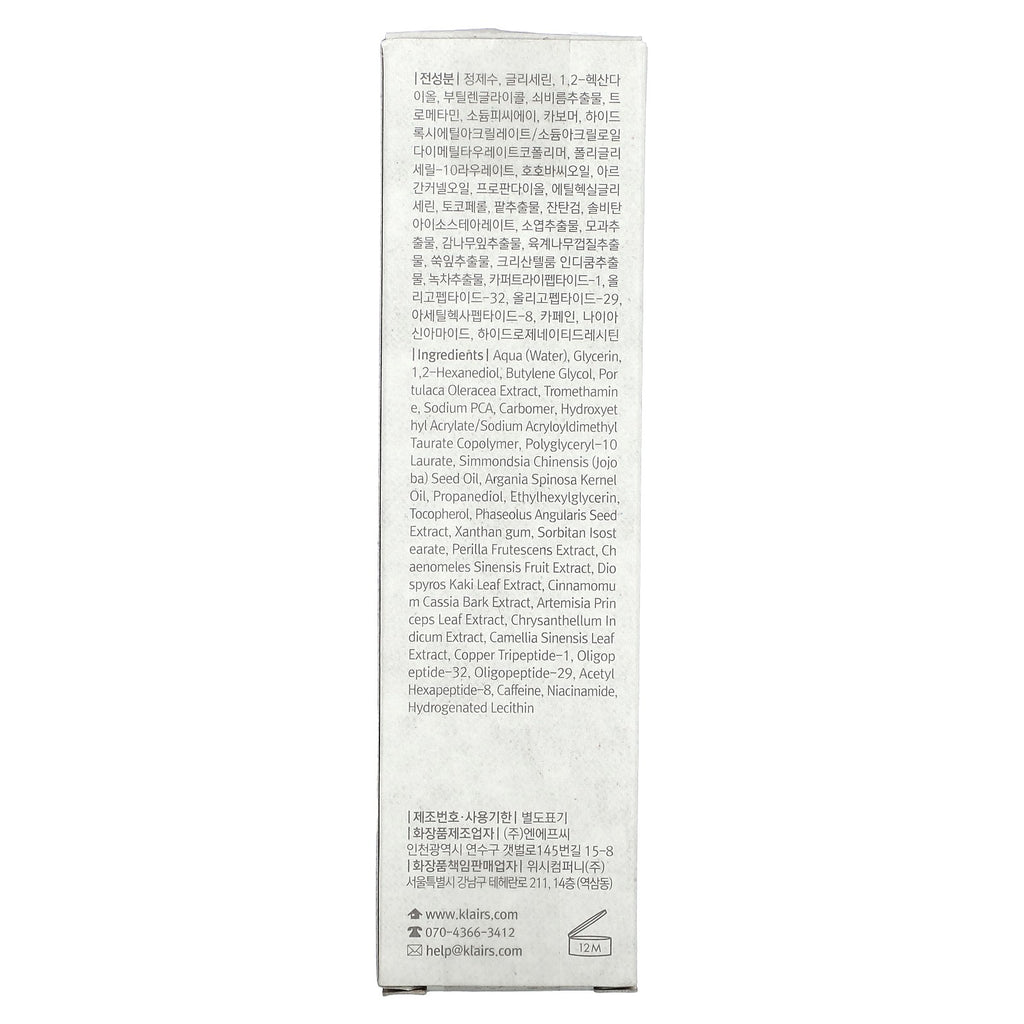 Aqua (water), glycerin, 1,2-hexanediol, butylene glycol, portulaca oleracea extract, tromethamine, sodium pca, carbomer, hydroxyethyl acrylate/sodium acryloyldimethyl taurate copolymer, polyglyceryl-10 laurate, simmondsia chinensis (jojoba) seed oil, argania spinosa kernel oil, propanediol, ethylhexylglycerin, tocopherol, phaseolus angularis seed extract, xanthan gum, sorbitan isostearate, perilla frutescens extract, chaenomeles sinensis fruit extract, diospyros kaki leaf extract, cinnamomum cassia bark extract, artemisia princeps leaf extract, chrysanthellum indicum extract, camellia sinensis leaf extract, copper tripeptide-1, oligopeptide-32, oligopeptide-29, acetyl hexapeptide-8, caffeine, niacinamide, hydrogenated lecithin.