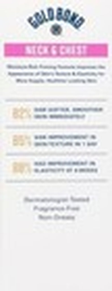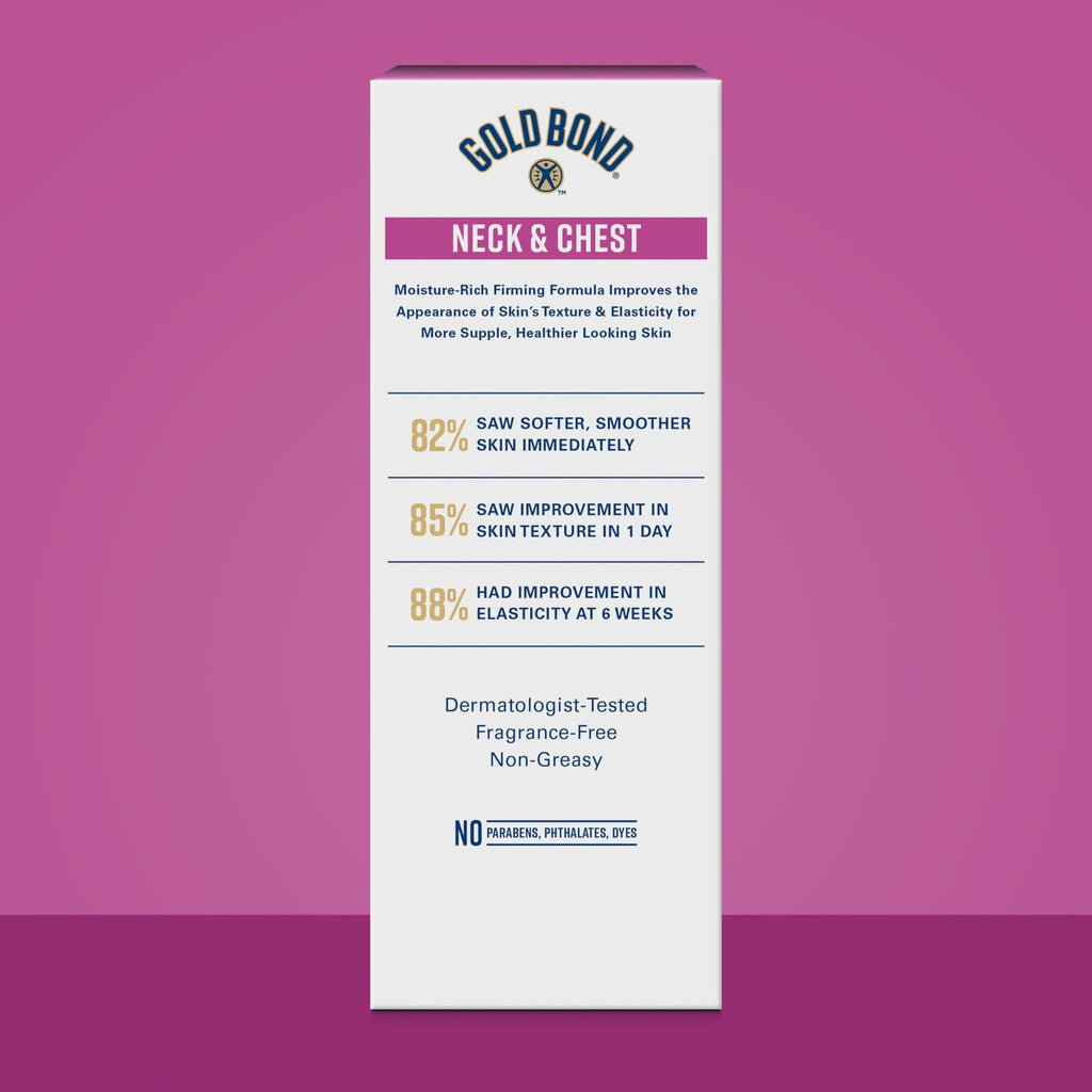 When you look in the mirror, does your neck and chest area give away your age Gold Bond Neck and Chest Firming Cream contains hyaluronic acid and visibly firms neck and chest skin to reveal youthful-looking skin. Your neck and chest area have different skin from the other skin on your body, and this formula works on this delicate area to help visibly improve elasticity and firmness. Specially developed to help nourish aging skin, this body cream features a blend of key ingredients to provide long-lasting hydration. Best of all, it's clinically tested, dermatologist tested, hypoallergenic, fragrance-free, nongreasy and fast-absorbing.