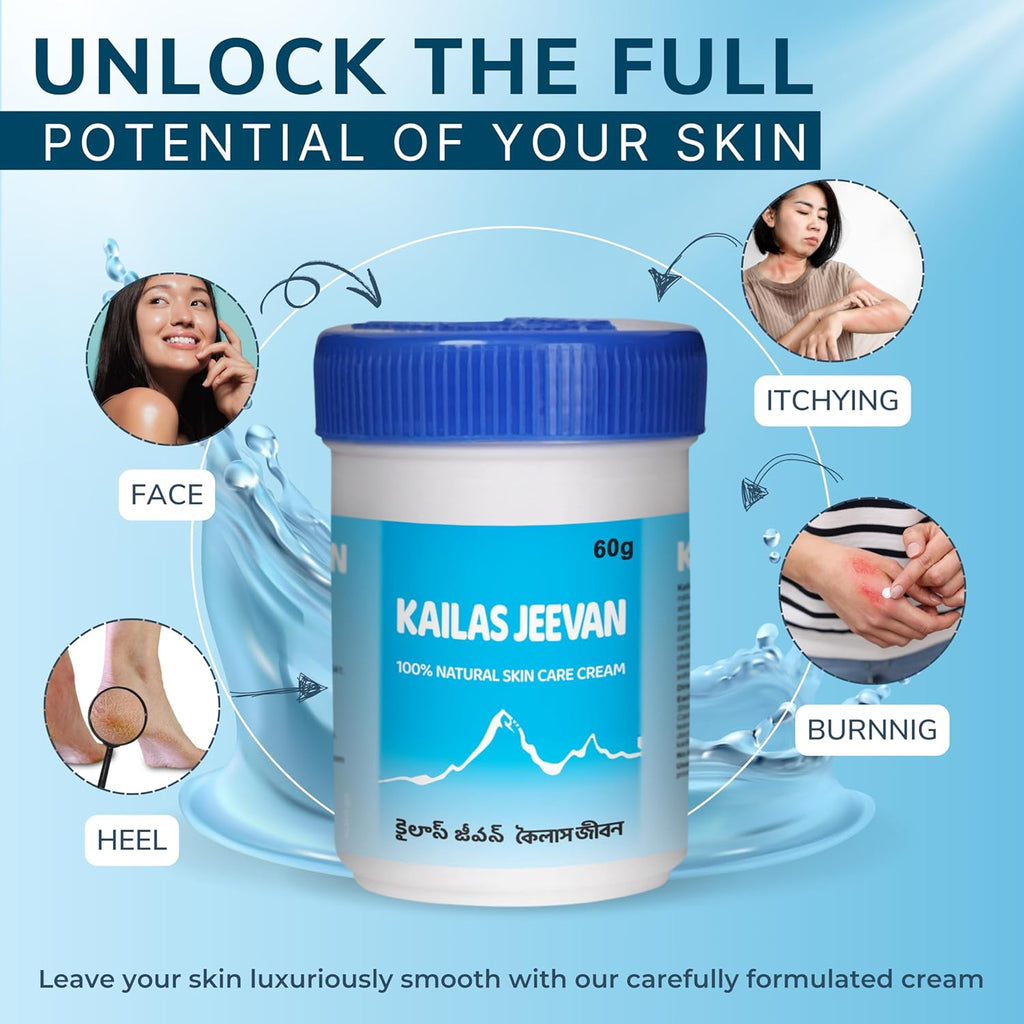 - Restorative Skin Moisturizing Formula: The Kailas Jeevan's creamy texture diligently removes dry skin, making it ideal for those dealing with flaking or rough patches. Infused with essential nutrients, this Skin Soothing Cream serves as a moisturizer for feet and body.