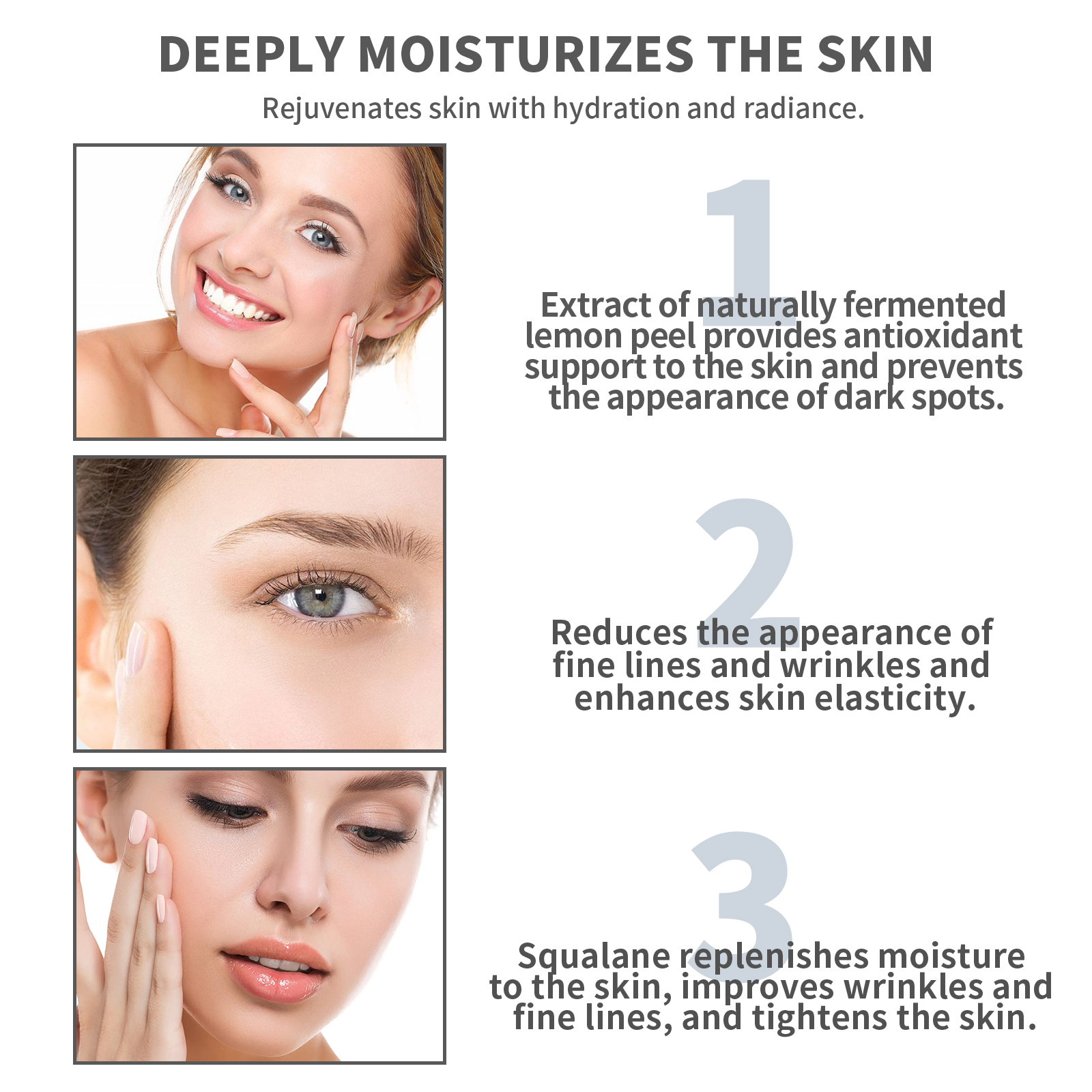 Our Squalane Vitamin C Rose Moisturizing Cream contains water, lemon peel oil, squalane. It can reduces the appearance of fine lines and wrinkles, tightens the skin, enhances skin elasticity, prevents the appearance ofdark spots, replenishes moisture to the skin, rejuvenates skin with hydration and radiance. Its use method is very simple: Cleansing and basic skin care, take an appropriate amount of cream and apply evenly on the face or neck, gently massage until absorbed. Deeply nourishes the skin, brightening the complexion and tightening the skin.