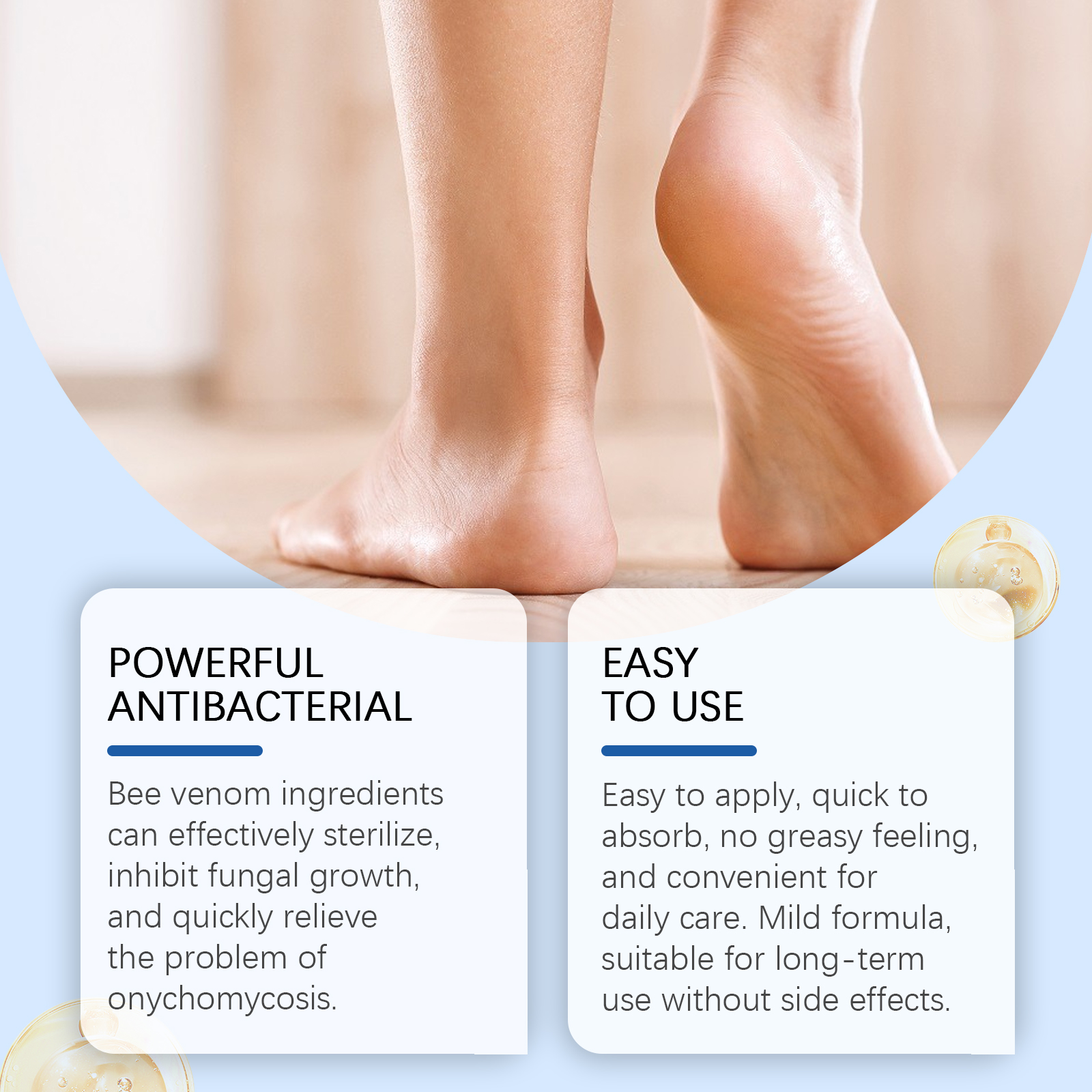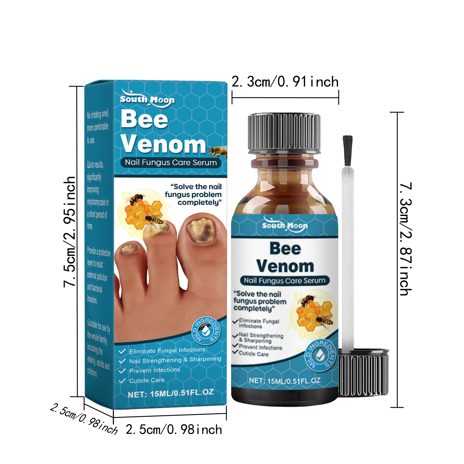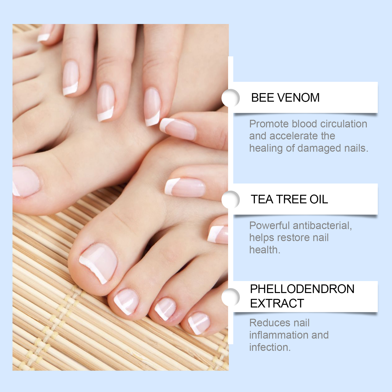 Our nail care essence is carefully formulated with tea tree oil, phellodendron extract and aloe vera extract. Designed specifically for effective sterilization, inhibition of fungal growth, and rapid alleviation of onychomycosis. The usage method is extremely convenient: Thoroughly clean and dry the nail area. Take an appropriate amount of this product, drop it onto the nail and the skin around the nail, and wait for 2-3 minutes for it to be fully absorbed. And it can reach deep into the root of the nail, promote healthy nail growth and repair damaged tissues.
