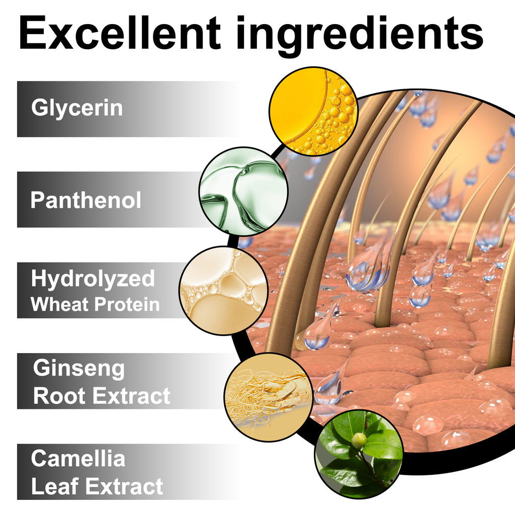 Our Anti-Shedding Hair Spray contain Glycerin, Panthenol, Hydrolyzed Wheat Protein. It nourishes and protects hair, as well as improving the health of hair follicles and promoting hair growth. Its application is simple: simply spray 1ml(about 4-5 sprays) onto dry hair and directly onto the top of the hair loss area of the scalp, let it dry, and then style your hair as usual, using 3-4 times a day for best results. It can deeply awaken dormant hair follicles, promote the growth of new hair, and make hair healthier and thicker.